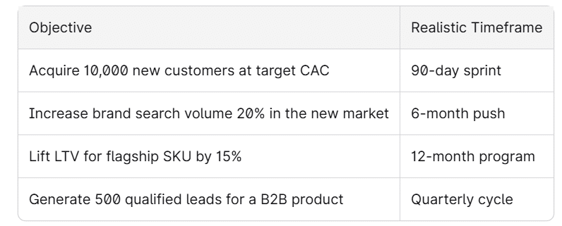 Awareness and brand perception goals may take 3–6 months to fully quantify through brand lift studies and search trend analysis. We recommend committing to at least two consecutive 90-day cycles before making major strategic changes. Some quick wins, like swapping creator UGC into paid ads, can impact paid efficiency within a few weeks.