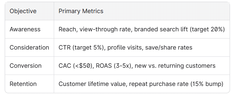 For DTC beauty, focus on immediate sales and repeat purchases. For subscription apps, track trial-to-paid conversion over 30-60 days. For B2B SaaS, measure qualified leads and pipeline influence over 90+ days.