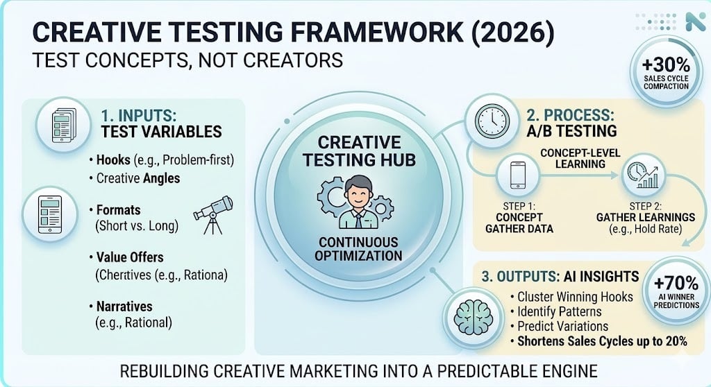 A modern engine continuously tests hooks, angles, formats, and offers using creator content as the main testing ground.